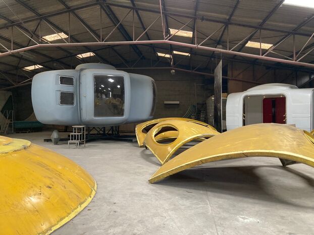 À Juranville, dans le Loiret, d’immenses hangars abritent toutes les pépites de ce passionné atypique. Ces hangars abritent aussi ses ateliers de restauration. Sa collection compte les oeuvres les plus significatives et emblématiques. Parmi elles, une « maison Bulle » à six coques de 36 m2 créée par Jean-Benjamin Maneval. Cette maison a servi de point d’accueil aux magasins Prisunic en 1967. Des « Cellules 2002 » produites par Algeco en 1969 ont été conçues pour les promoteurs immobiliers. Des mobile homes hexacubes ont été créés en 1971 pour un centre de vacances à Port Leucate. Il y a aussi des pièces plus confidentielles. Par exemple, un bloc sanitaire « Savoie » a été conçu pour la station des Arcs en 1975. Un rare bureau « Coquille » datant de 1968 a été imaginé pour le fondateur de Cacharel. Des éléments de la piscine « Tournesol » sont aussi présents. Cette oeuvre est emblématique du plan 1.000 piscines que l’État a lancé en France en 1969. Sa maison 12E nécessite un gros travail de restauration. Des panneaux d’Airbus occupent également les lieux. Des petits véhicules « Sinclair » fabriqués en 1985 pour les hommes d’affaires londoniens y sont aussi présents.